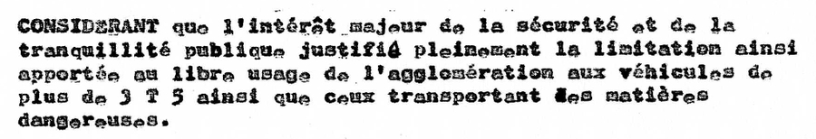Considérant que l'intérêt majeur de la sécurité et de la tranquillité publique justifie pleinement la limitation ainsi apportée au libre usage de l'agglomération aux véhicules de plus de 3.5 T ainsi que ceux transportant des matières dangereuses